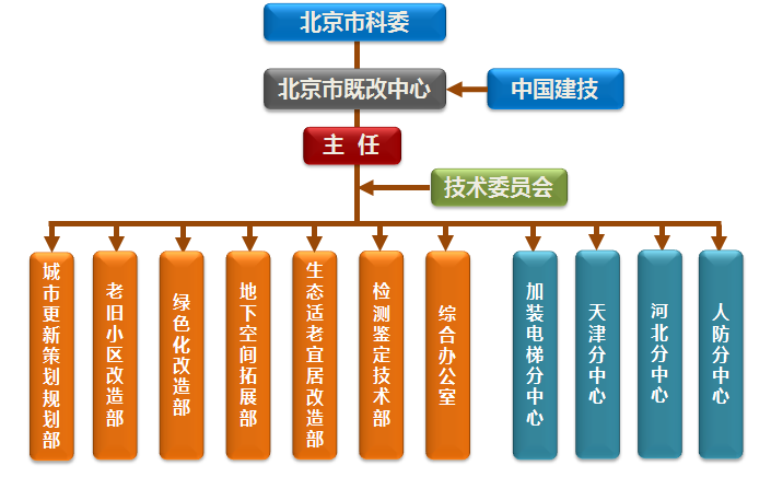 中心下設(shè)城市更新策劃規(guī)劃部、老舊小區(qū)改造部、綠色化改造部、地下空間拓展部、生態(tài)適老宜居改造部、檢測鑒定技術(shù)部和綜合辦公室。為加強協(xié)調(diào)創(chuàng)新,中心整合京津冀行業(yè)優(yōu)勢資源,與北京筑福研究院、天津大學(xué)、中土大地公司、北京廣源興業(yè)科技發(fā)展有限公司聯(lián)合成立了加裝電梯分中心、天津分中心、河北分中心、人防分中心。