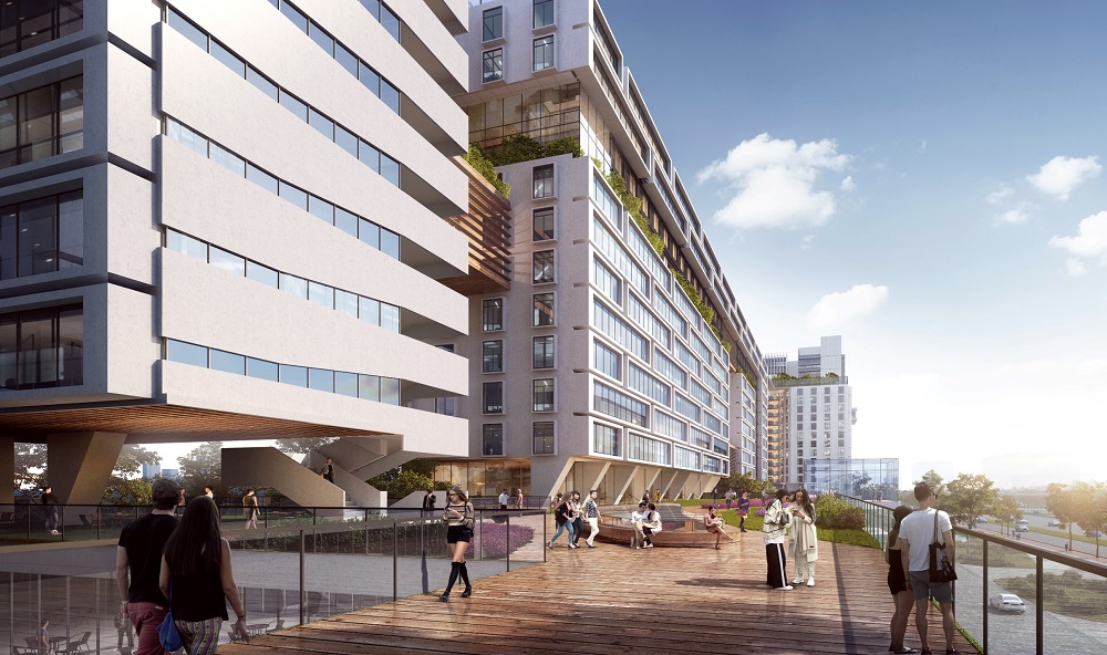 活力天街場(chǎng)景——構(gòu)思利用300余米長(zhǎng)的架空平臺(tái)加上400余米長(zhǎng)起伏的景觀步道,形成總長(zhǎng)800米、貫穿整個(gè)基地的帶狀連續(xù)步行空間(天街),避開(kāi)喧囂,開(kāi)放視野,一路通達(dá),體驗(yàn)活力。