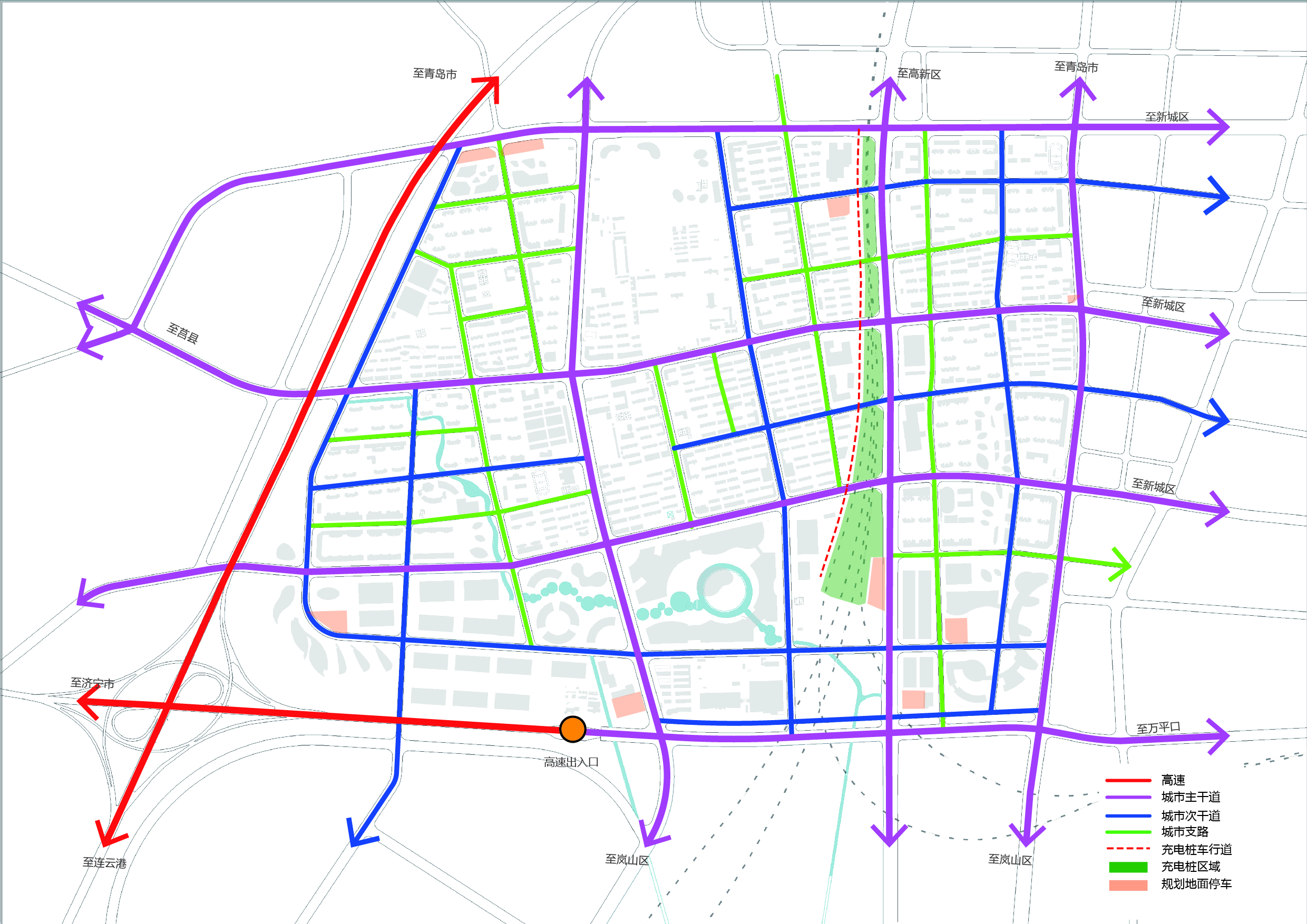 立足基地現(xiàn)狀條件,優(yōu)化功能部署。東向承接老城區(qū)的人口疏散和居住功能;南向突出城西形象展示的門戶功能,重點培育物流總部辦公、現(xiàn)國際代商貿(mào)、現(xiàn)代物流、都市農(nóng)業(yè)等產(chǎn)業(yè)功能。西向處理好生態(tài)防護和跨高速交通聯(lián)系的要求。北向完善高品質(zhì)生活配套。