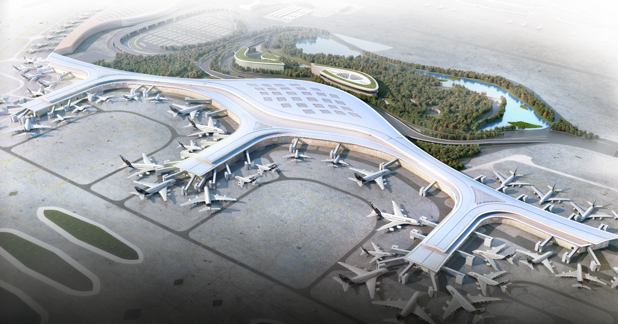 合肥新橋國際機場T2航站樓總建筑面積約36.98萬平方米,采用“雙港灣+雙L”的建筑構(gòu)型,主樓面寬約400米、進深約180米。南、北兩側(cè)指廊寬42米,為國內(nèi)候機指廊;中指廊寬54米,為國際候機指廊。主體結(jié)構(gòu)為鋼筋混凝土框架,屋頂為大跨度空間鋼結(jié)構(gòu)體系。